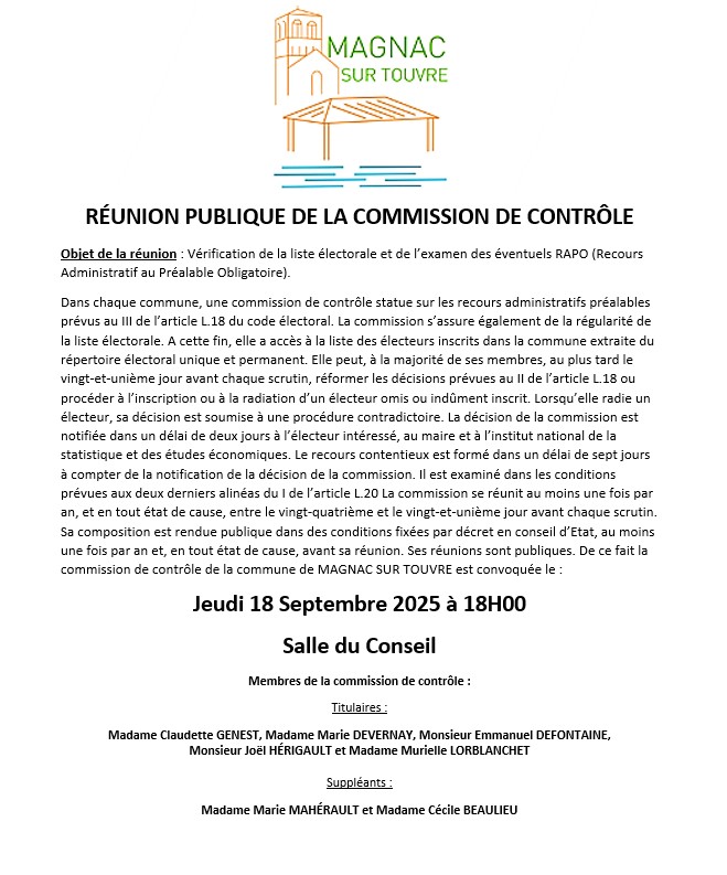 Commission de contrôle des élections 18-09-2025 Le jeudi 18 Sep 2025 à 15h03 PM Les categories associées : Commissions municipales, Infos pratiquesJ’aime ma villeNos agendasDroits et DémarchesNous contacterAssociationsUrgences et GardesMenusSallesImagePartager :