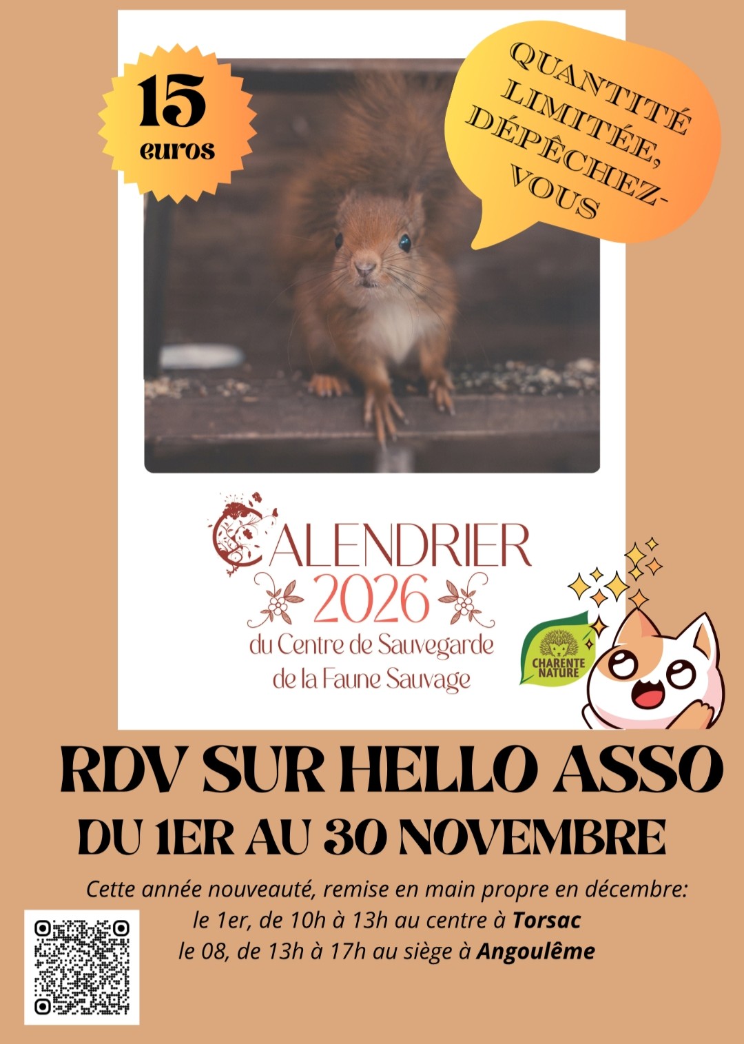 Le Centre de Sauvegarde de la faune sauvage de Torsac appartenant à Charente Nature organise actuellement une vente de calendriers, dont les bénéfices sont entièrement dédiés à l’activité principale : l’accueil et les soins à la faune sauvage protégée blessée ou en détresse.