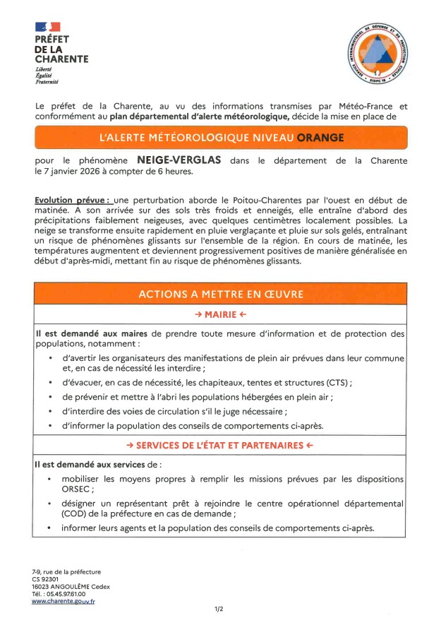 VIGILANCE ORANGE NEIGE-VERGLAS Le mardi 06 Jan 2026 à 16h02 PM Les categories associées : Démarches administratives, Environnement, Gestion des risquesJ’aime ma villeNos agendasDroits et DémarchesNous contacterAssociationsUrgences et GardesMenusSallesImagePartager :