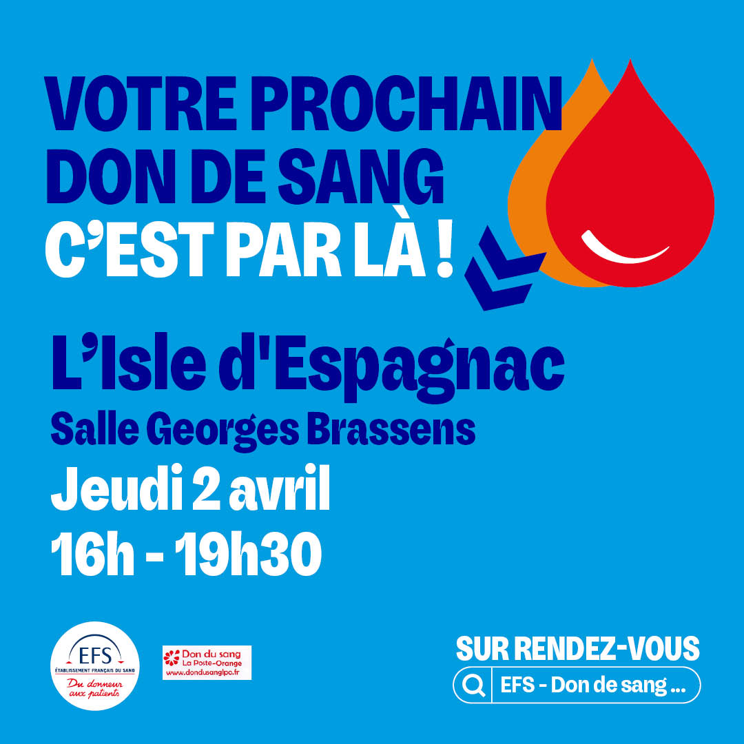 L’ISLE D’ESPAGNAC – DON DE SANG 02-04 Le vendredi 20 Mar 2026 à 14h50 PM Les categories associées : Infos pratiques, SantéJ’aime ma villeNos agendasDroits et DémarchesNous contacterAssociationsUrgences et GardesMenusSallesImagePartager :